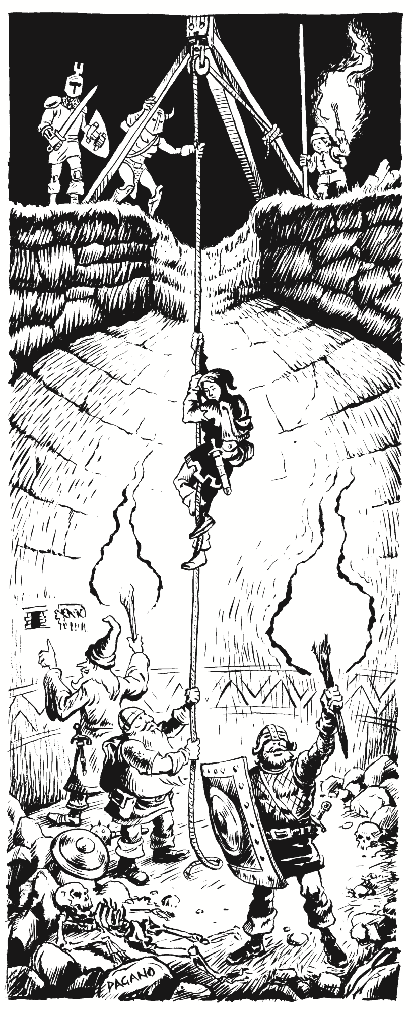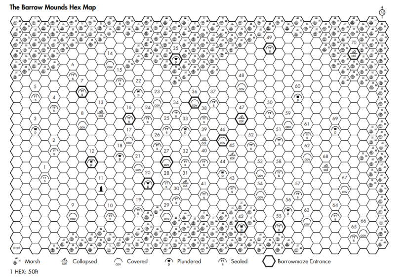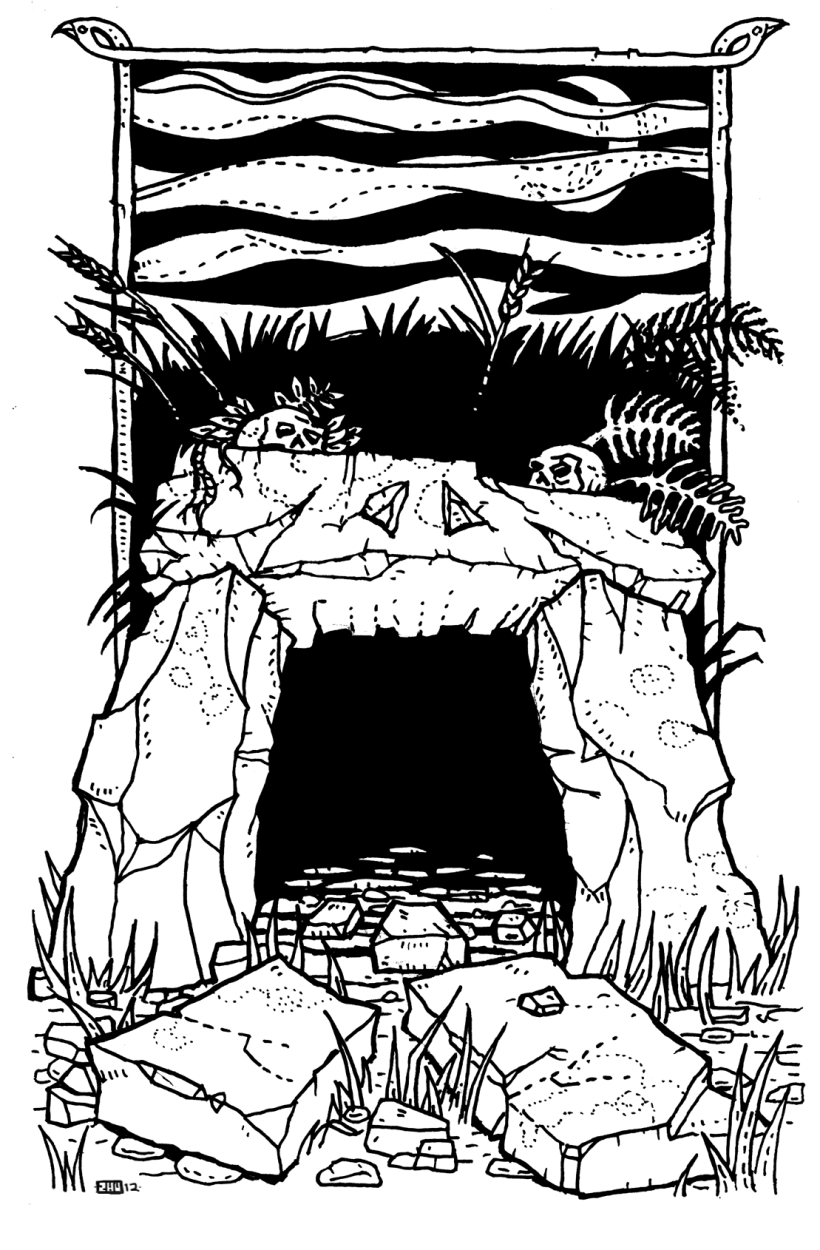 Od obelisku se pak nedá přehlédnout jednu z mohyl, jejíž dveře jsou rozvrácené dokořán a kolem které jsou patrné známky ne zas tak dávné aktivity. Vydali se tedy opatrně nahlédnout, a zjistili, že mohyla je sice zcela vybrakovaná, ale v podlaze, pod provizorním rumpálem, zeje jáma vedoucí do jakýchsi podzemních prostor. Bojovník se nebojácně vydal dolů na průzkum – přečetl si dole varovnou zprávu, že si má dávat pozor na velkého minotaura, a naschvál několikrát nahlas vykřikl, a pak naslouchal. Zaslechl zvuky krys, ale také vzdálené zabučení – po tom už radši mluvil tiše. (Zabučení je ve skutečnosti jeden z proměněnců, dorozumívají se různými zvuky, vybral jsme to celkem bezmyšlenkovitě, jen aby to bylo trochu podezřelé, ale hráči si samozřejmě myslí, že je to minotaur.)