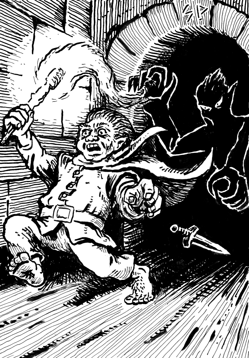 Nakonec si na něj troufli, klerik se pokusil o odvracení nemrtvých, ale špatný hod znamenal, že akorát nabral stres, když odolával nenávisti místa tak silně zasvěceného Nergalovi. Kouzelník tedy sáhnul po jednom ze svých dvou velkorážních svitcích, a pokusil se proti stínu použít své silné světlo. Svitek sice samozřejmě měl původně dělat trochu jiné věci než zabíjet stíny, ale dává mi to smysl, takže jsem jej nechal zkusit kouzlo ve svitku při seslání trochu modifikovat. Nepovedlo se to úplně ideálně, mág při tom na chvíli oslepnul a Stín to jen zahnalo, nezabilo, ale dalo to družině dost času na to, aby popadla meč a zlatý prsten. Pak už ale opravdu před nasraným fantomem vzali nohy na ramena a utekli zpět na povrch.