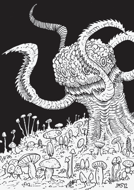 Družníci se tedy otočili zpět a pustili se jižním schodištěm, jak bylo jejich původním plánem. Sály kolem černého obelisku zůstaly od poslední návštěvy tiché a nehybné, a tak za chvíli stáli před ústím organicky vypadajícího tunelu, který do jednoho z nich ústil. Chodba se zde zdála dostatečně prostorná pro člověka, ale rozhodně nevypadala zhotovená řemeslně – stáčela se, kroutila, měnila šířku a na některých místech vypadala vyhrabaná snad jakýmisi drápy. Dobrodruzi se tedy seřadili a opatrně se pustili dle pravidla pravé ruky do spleti křížení, slepých odboček a prudkých zákrut. Prvně našli jezírko s houbami, které při osvětlení začaly hlasitě pištět. Lupič se sice chtěl do jezírka podívat, zda tam nenajde něco cenného, ale některé houby se po něm začaly ohánět jakýmisi chapadly a tak se spokojil s tím, že jen nahlédl z povzdálí, a ničeho blyštivého si nevšiml. Po té našli hnízdo ohnivých brouků – opět si jen potvrdili, že je to slepá chodba a nechali je být.