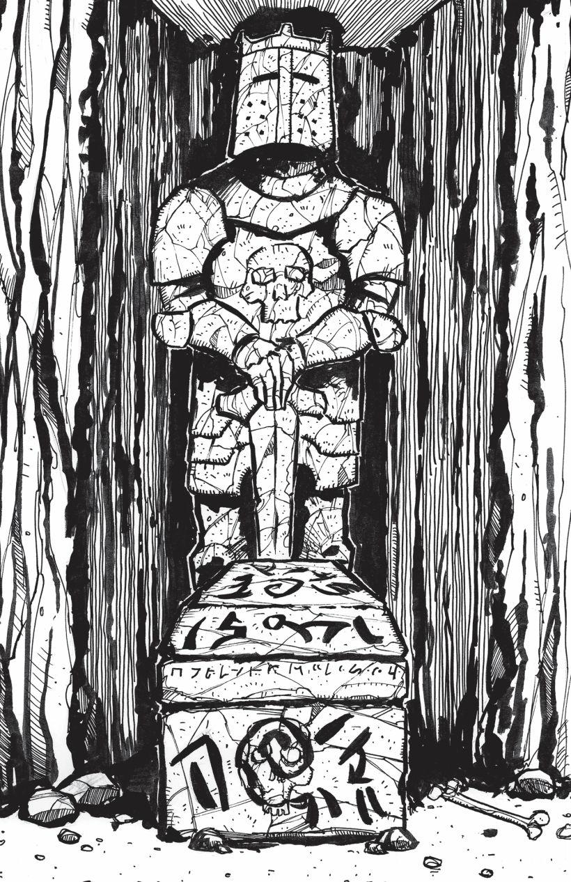 Po této výhře (a po tom, co válečník opět zmenšil svou sekeru tím, že zaklínadlo odříkal pozpátku) se znova pustili po tunelu po pravé ruce a prolezli jím do vyzděné místnosti, v níž tři sochy zlověstně vypadajících bojovníků sledovali centrální sarkofág pokrytý ošklivými runami vyvedenými zaschlou krví. Lupič se opatrně zkusil dostat blíž, avšak když se přiblížil k sarkofágu, sochy tasily své meče. Rychle uskočil zpět do bezpečí tunelu, a tím je opět uklidnil. Chvíli se radili, zda se oplatí zkoumat takto očividně prokleté místo, ale jeptiška se pak pomodlila ke svému bohu a ten jí jasně ukázal, že artefakt, který hledají, je zavřený v tomto sarkofágu, a že jej musí získat. Modlitba také odvála temné runy, avšak zároveň popudila kamenné strážce, kteří znova tasili a vydali se k narušitelům. Lupič rychle hodil do místnosti olej kluzkosti, a jeden z kamenných válečníků na něm ztratil rovnováhu a ztěžka dopadl na zem. Druhý však už byl příliš blízko, válečník po něm tedy hodil ještě ampuli s kyselinou, kterou si sám uvařil – bohužel efekt na kamennou sochu byl slabší, než doufal. Kopnul do sebe tedy lektvar obří síly, a pak jej ještě napadla jedna věc – rozřízl si dlaň a pocákal sochu svou vlastní krví, a pak jí bodnul svým mrazícím mečem přímo do průzoru v helmě. Mráz sochu rozpraskal a jeptiška jí pak dorazila mocným úderem kladiva. S druhou sochou se vypořádali obdobně.