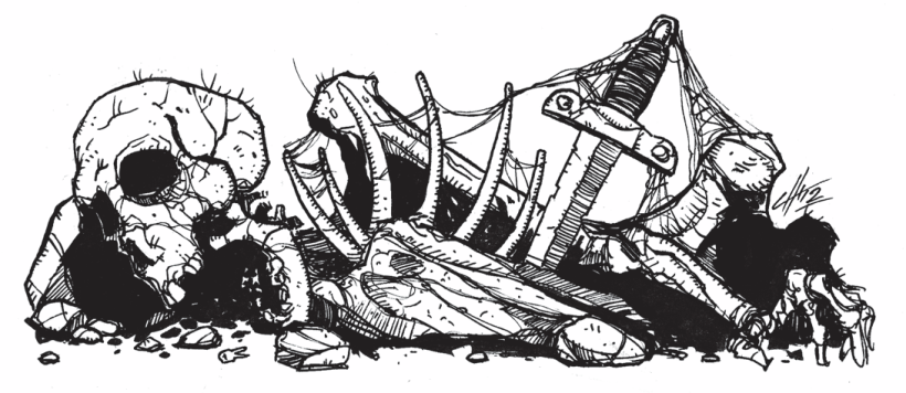 S tímto zjištění si rychle odvodili, že dlouhá chodba na sever, ze které se dá odbočit do komory s teleportem, nejspíš povede do sálu, kde porazili velkého hada, a záhy si to i ověřili. Po cestě chodbou minuli tři výklenky – dva z nich byly proražené zevnitř, třetí stále stál zazděný. Rozhodli se do něj podívat, a když vybourali dostatečně velký kus, aby válečník nakoukl, zevnitř jej chňapla kostlivá ruka a začala jej táhnout dovnitř. Válečník se chvíli bránil, ale pak si řekl, že jednoho kostlivce přece porazí, a naopak za ním skočil dovnitř. Když se ocitl ve tmě výklenku, aniž by cokoli viděl, uslyšel nezaměnitelný zvuk tasené čepele, a jeptiška se vyděšeně zeptala, jak může vědět, že tam kostlivec je jen jeden, poněkud zblednul, ale to přiskočil lupič se svým čerstvě uloupeným palcátem, praštil s ním do kostlivce a ten se na jednu ránu rozletěl na kusy – naštěstí se ukázalo, že Henryho palcát je skutečně magický, a že v kryptě byl opravdu pohřben jen jeden bojovník. Bohužel však zjistili, že byl pohřben jen se svým – nyní již velmi rezavým – mečem.