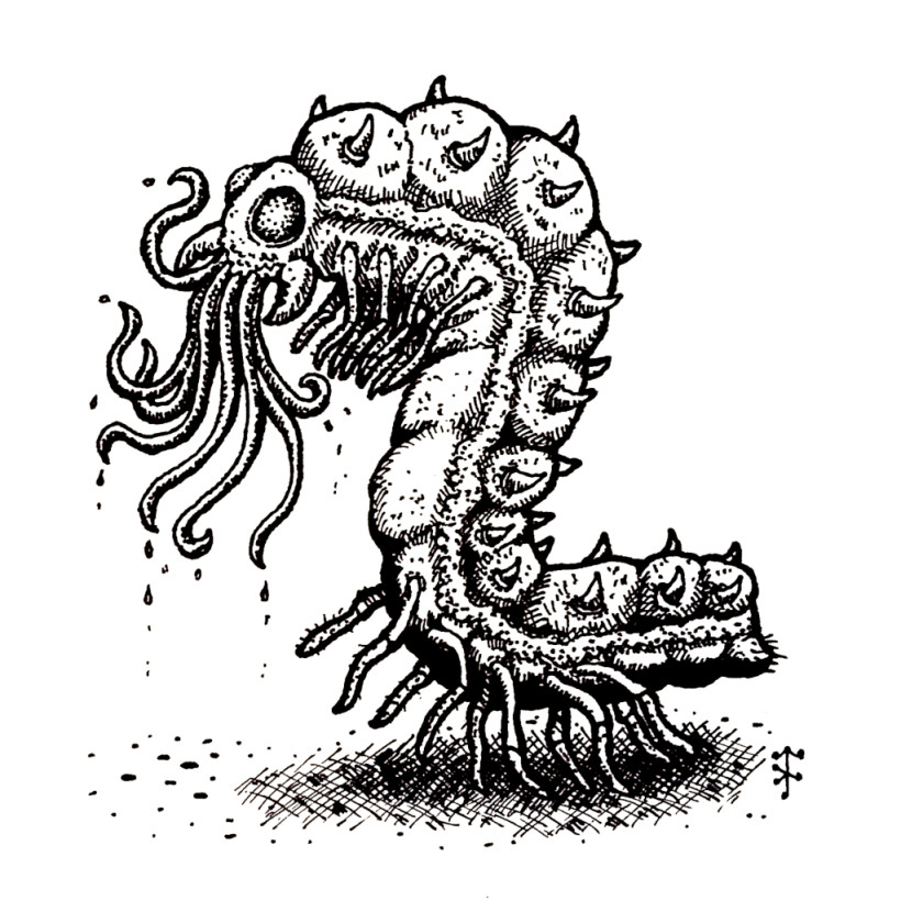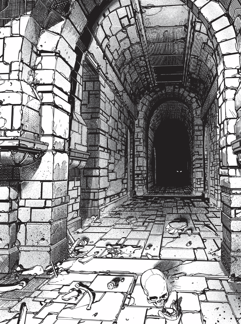 Pustili se dále, až našli místo, kde se tunel opět probourával do vyzděné místnosti – její podlaha byla pokrytá kostmi. Lupič se opatrně pustil dovnitř, avšak jen co vkročil, ze stropu na něj zaútočilo jakýchsi osm chapadel, tak tak uskočil. Vyděšeně a vyčerpaně se dohodli, že tohle si nechají na příště a kostnici nechali být, a brzy došli zpět k místu, kde do tunelů původně vešli. Prohlédli si mapku, kterou si dělali, a uvědomili si, že asi obešli bludiště chodeb po obvodu, ale chybí jim ještě jeho centrální část. Vydali se tedy ještě jednou zpět, po chvíli proplétání se ale zjistili, že jsou zpět v místnosti s netopýry, a že tedy už v bludišti není nic než spojovací chodby. V ten moment ale něco zaútočilo zezadu – lupič, který stál vzadu, na poslední chvíli uslyšel pohyb, otočil se a opět uviděl osm chapadel. To už na něj bylo moc a v panice se vrhnul pryč – jenže ohromná vypasené housenka s osmi chapadly na hlavě jim blokovala jediný únik z místnosti. Jeptiška, která byla další na řadě, se jí pokusila postavit, jenže i když po ní šlo jen čtvero chapadel, vyhnula se jim jin s největšími obtížemi a nestvůru přitom nedokázala ani škrábnout. Válečník však využil příležitosti, kdy byla příšera zaměstnaná, a vrhnul se jí bokem k tlustému tělu, kde ji zasadil hlubokou ránu svým mrazícím mečem. Housenka překvapená bolestí začala couvat, aby unikla, a válečník nadšený svým úspěchem se za ní vrhnul a zkusil jí dorazit.