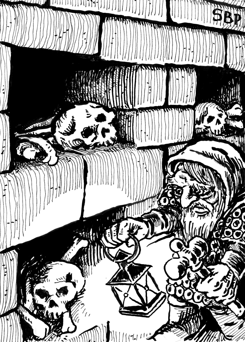 Pak otevřeli druhé dveře (53), a v této místnosti krom běžných výklenků spatřili také několik větších – dost velkých, aby v nich mohla být ve stoje pohřben celý člověk. Z těch vystoupilo šest postav v černých kutnách, a otočilo temné prázdné důlky svých lebek na narušitele. Dobrodruzi se postavili do výhodné pozice ke dveřím, a první dva kostlivce rozbili na padrť. Jenže tihle nemrtví přeci jen nebyli tak hloupí, a když viděli, jaká je situace, do dveří se dále nehrnuli. Zůstali ve své kryptě, rozestavení kolem dveří, a mrtvými výrazy hleděli na dobrodruhy – a ti si v tento moment všimli, že ze západního směru se blíží jakési bzučení. (Haha, ideální příležitost vytáhnout opomenuté mouchy. Příliš se s tím tady na můj vkus zasekli, a tohle je zrovna část podzemí, která sice není úplně nebezpečná, ale je celkem "živá", takže mi přišlo vhodné nenechat je mít na všechno kolik jen času si usmyslí.) Vyslali rychlého zvěda podívat, se, co se blíží, ale ten se hned vrátil s tím, že sem letí šest obřích much. Nebylo času na velké rozmýšlení, jeptiška a bojovník se vrhli na kostlivce v místnosti, doufajíce, že je takto rozdrtí – bojovníkovi se podařilo tímto dravým výpadem složit hned dva, jenže sestra Hiltrůda dopadla hůře. naběhla na jednoho z kostlivců se svým štítem, že jej rozdrtí, místo toho se však zapletli do sebe takovým způsobem, že se jí nedařilo vyprostit a kostlivec jí začal drápat svými kostlivými drápy záda. Málem by ji rozdrápal, kdyby ji bojovník nezachránil jednou přesnou ranou, která se zastavila pouhý coul od jeptiščina krku.