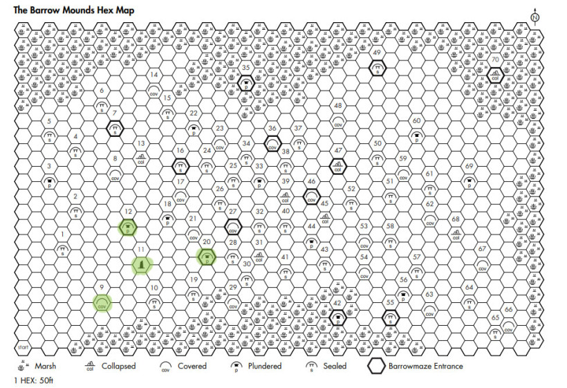 Družníci si ve městě dokoupili jen nejnutnější zásoby a jednu kuši, a jen co se jeptišce zahojily minulé rány, vydali se zpět do Mohylovišť. Prvně se s lopatami pustili do první mohyly, kterou už obhlíželi minule (9). Po pár hodinách práce se jim odkryly kamenné desky hradící vchod – avšak radost přerušilo několik šourajících se postav, které se vynořily z mlhy a bez hlesu se sápaly po narušitelích. Družina se stáhla na vrchol mohyly do obranné pozice a ubránila se. Když pak prohlédli nyní již opět mrtvá těla, zjistili, že jde nejspíš o dobrodruhy, kteří zde zemřeli minulý rok. Poznačili si, odkud nemrtví přišli, a pak konečně otevřeli odkopanou mohylu.