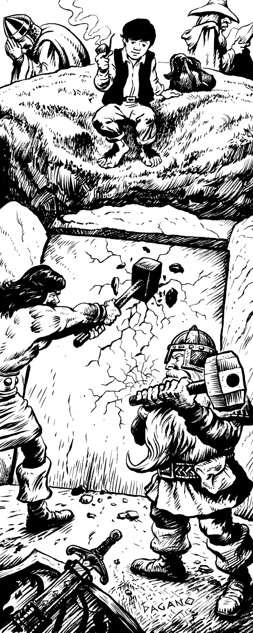 Zloděj opatrně nakoukl a všiml si jakého si pohybu na stropě. Dobrodruzi se hned upamatovali, že zde před týdnem viděli nějaké přerostlé stonožky. Posvítili si na strop a kouzelník zkusil svou novou kuši,. Byť střílet stonožky nebylo snadné, ty zároveň přišly o svůj moment překvapení a proti připravené a ozbrojené družině neměli moc šancí. Válečník si na nich vyzkoušel meč, který minule uzmuli z krypty – už předtím zkoušel, jak by mohl probudit jeho kouzlo, a vypadá to, že meč, když seká do krve, zasazuje mrazivé rány. Dvě takto zmrazil a rozsekl, a zbylé radši utekly. Pak prozkoumali 4 sarkofágy, které se v mohyle nacházely – jeptiška se prvně pokusila vycítit, zda zde nejsou nemrtví, a zdálo se jí, že zde nic tak nesvatého necítí. Družníci tedy sarkofágy otevřeli a s potěšením zjistili, že pohřbení mají na sobě šperky a cennosti – které samozřejmě sebrali.