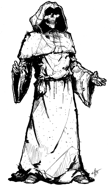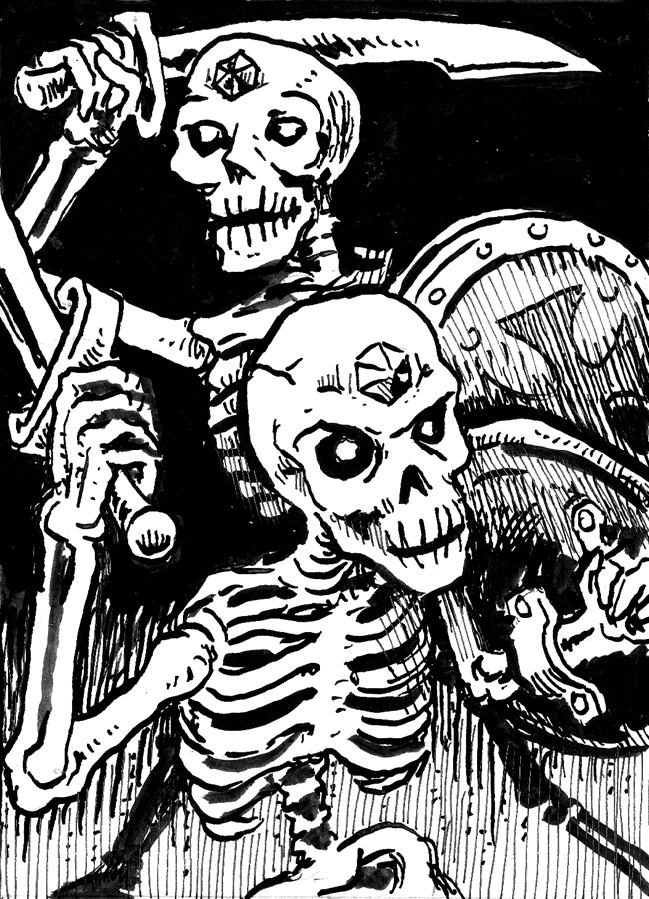 Kouzelník tedy sáhl do svého vaku, vytáhl svitek magických blesků, a seslal je proti blížící se skupině nemrtvých – tři z kostlivců se pod magickým zášlehem rozpadli. Proti dalším se bok po boku postavili bojovník a jeptiška – avšak tentokrát nešlo o žádný souboj s mouchami, a jeptiška jen tak tak štítem vykrývala prudké rány tichých bojovníků. Jednoho udolali, avšak jeptiška se musela stáhnout (vyčerpala všechen stres a byla po zbytek scény vyřazená). Bojovník se pokusil o odvážný výpad, aby jí dal možnost ustoupit, a skutečně se mu povedlo dalšího kostlivce složit svou sekerou k zemi – avšak když si v ten moment družníci všimli, že se některé kostry, které před chvílí srazili k zemi, opět začínají zvedat a sápat po zbraních, usoudili, že je správná chvíle k ústupu. (Kostlivci se safírem jdou zničit jen odebráním safíru.)