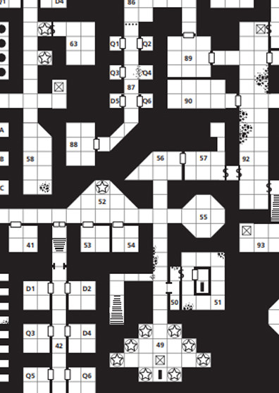 V severní místnosti (56) spatřili na zdi naškrábaný nápis “Nechoďte dál!” a hromadu kamení – odházeli pár a potvrdili si, že jde o mohylu jakéhosi dobrodruha. Když zjistili, že u sebe nemá žádné cennosti krom amuletu se svatým symbolem svatého Ygga, který mu tedy nechali (ten v původním textu není, ale přišlo mi jasné, že by navršená kopa kamení měla být mohylou), jali se hledat ten průchod dál, kterým prý nemají chodit. (Původně to nemají být tajné dveře, ale nějak jsem je zapomněl zakreslit a popsat, takže se z nich tajné staly. Ono to i dává smysl.) Očekávaná tajná chodba vedla na východ a otevírala se do prázdné místnosti (57) – prach na zemi však naznačoval, že tomu není příliš dávno, co prázdná nebyla. Zdálo se, že na zemi leželo nahromaděno spousta věcí. (V téhle místnosti mají číhat proměněnci se svými poklady, ale mají šanci 3:6, že uslyší dobrodruhy přicházet a připraví se. Jenže naše družina se vedle docela dlouho pachtila s odhazováním celé mohyly, i přes varování, nedbajíc na hluk, takže proměněnci ji nejen dobře slyšeli, ale měli plno času se rozhodnout, že radši svůj poklad sbalí a utečou.) Hledali tedy další průchod, a skutečně – sice ne tam, kde jej čekali, ale po nějaké době a zapálení nové pochodně zjistili, jak otevřít průchod pokračující dále na východ.