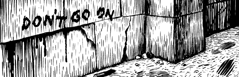 Prošli jakýmsi sálem, u jehož severní stěny obešli jakýsi oltář (#75) a dále do dlouhé chodby, kolemž její severní stěny stálo několikero zavřených krypt (#74). Kouzelník zde už cítil, že jsou blízko, a dohodli se tedy, že je nyní třeba postupovat obzvlášť opatrně – nejspíše je tady něco, co zabilo kouzelnici Alexu. Lupič se tedy opatrně jal prozkoumávat cestu, a všiml si jakési stopy slizu, která vedla z krypty přímo oproti nim (#74F). Oparně tedy kryptu otevřeli – ale nenašli v ní nic. Trocha slizu, prach a prázdné police. Pokračovali tedy dále. U čtvrté na dveřích našli nápis křídou “Tudy nechoďte”. Bojovník poznamenal, že takové vzkazy jako “Zde není past” dobře znají, a došli tedy až k té předposlední, u které mág jasně cítil, že jsou na místě – zároveň to ale nyní cítili všichni, protože se z těchhle dveří šířil nechutný zápach rozkládající se mršiny (#74B). Bojovník tedy opatrně otevřel – a vypadla na něj mrtvola v plesnivém, modrém rouchu, v tak pokročilém stádiu rozkladu, že se rozpadla a roztekla po okolí. Zápach byl tak odporný, že se dobrodruzi rozkuckali a museli s klením ustoupit a trochu to rozdýchat. Když se konečně trochu zmátožili, zjistili, že tento hluk nejspíš přilákal pozornost, a že od východu slyší již známý zvuk kostí klepajících o kamennou podlahu. Rychle zhasli pochodeň, skryli lucernu a přichystali se do výklenků mezi kryptami na přepad, bojovník se sekerou, jeptiška s palcátem, lupič s páčidlem a bojovník s čerstvě připraveným svitkem mrazivého kouzla.
