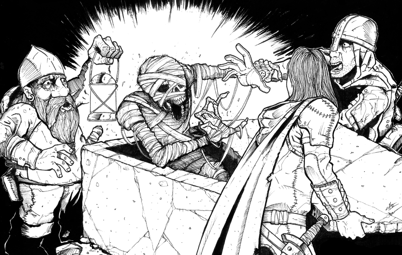 Pak vzali páčidlo a krumpáč, bojovník se přichystal se sekerou, kouzelník s kuší, a zabrali za víko. Když se trochu nadzvedlo, uvnitř se něco pohnulo – a následně to odhodilo víko brutální silou přes místnost. Připravený bojovník rovnou rázně ťal svou sekerou, jenže byť zasadil mumii docela hlubokou ráno přímo na klíční kost, ta se jen ohnala rukou, sekeru si vytrhla a málem mu ji vyrazila z ruky. Pak se dále sápala ze sarkofágu. Kouzelník po ni vystřelil, avšak minul, a než jeptiška stihla popadnout své nové kladivo, mumie už před nimi stála vztyčená – se zlatou korunou na hlavě. Kouzelník rychle vytahoval mrazící svitek, a lupič se trochu nejistě snažil alespoň svítit a případně krýt cestu pro útěk, bojovník se rychle natahoval po pochodni, kterou nechali na zemi, a jeptiška se rozehnala kladivem – jenže i přes to, že kladivo padlo ohromnou silou, mumie ránu bez potíží zarazila dlaní a druhou rukou chytila jeptišku pod krkem, a skoro to vypadalo, že jí jen tímhle stiskem doslova urve hlavu. Jeptišku naštěstí zachránil svatý symbol Sv. Ygga, který měla kolem krku a který ofáčovanou ruku začal spalovat, takže mumie ucukla a nechala jeptišce jen ošklivé škrábance. Ta se otřesená zapotácela, ale pak sáhla po svěcené vodě, kterou si tentokrát do podzemí přinesla – svaté věci se zdály fungovat lépe, nežli hrubá síla.