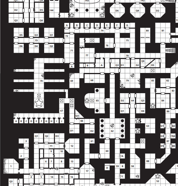To však dobrodruhy pořád tak docela neuspokojilo – chtělo by to poklad, ne jen nějaký klíč. Prozatím měli jen 64 zlatých mincí, což poděleno čtyřmi není zas takové terno. Dohodli se tedy, že zkusí systematicky projít tuto část podzemního labyrintu, aby si ujasnili svou mapu. Obešli tedy dokola chodbu, o které měli podezření, že dokola vede (78), poznačili si všechny dveře a také jedny schody směrem nahoru, a pak je začali postupně zkoumat.