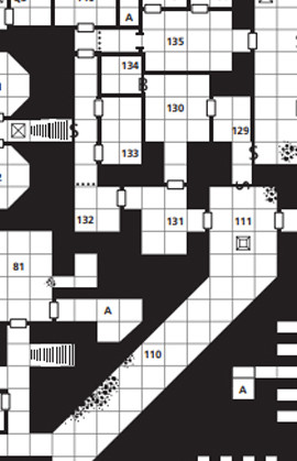 Zvedli tedy i další mříž a dostali se do místnosti s deseti otvory v podlaze (135). Opatrně prozkoumali okolí otvorů i strop nad nimi, pak se dovážili do nich nakouknout a nakonec zjistili, že v některých jsou páky, v některých nějaký bordel, v jedné zelený hlen a v jedné useknutá ruka. Ta je tak vyděsila, že otvory nechali být a rozhodli se pokračovat dál na východ.