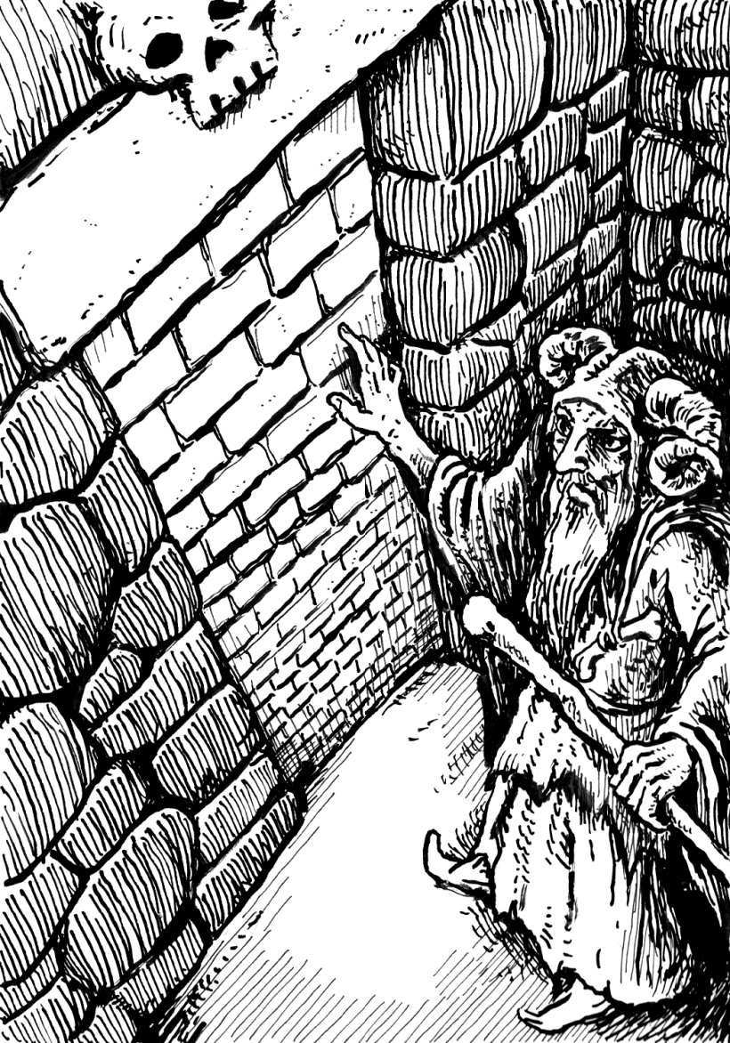 Když je však bojovník otevřel, spatřil několik kostlivců připravených k útoku, a k tomu se ozvalo nějaké zaříkání a najednou vše pohltila hustá tma. Bojovník sice dokázal odrazit několik útoků, ale když se setmělo a už je ani neviděl, rychle se po slepu stáhnul a dveře za sebou zabouchnul. Pak se družníci chvíli radili, co dál, a nakonec se rozhodli před dveře nasypat bodliny a sůl a stáhnout se za mříž, kde měli ještě jedny neprozkoumané dveře směrem na sever. Zloděj však pomocí zrcátka zjistil, že jsou na druhé straně zapečetěné jakousi stuhou s magicky vypadajícími runami, a tak je také nechali být a vydali se zpět za pavouky (130).