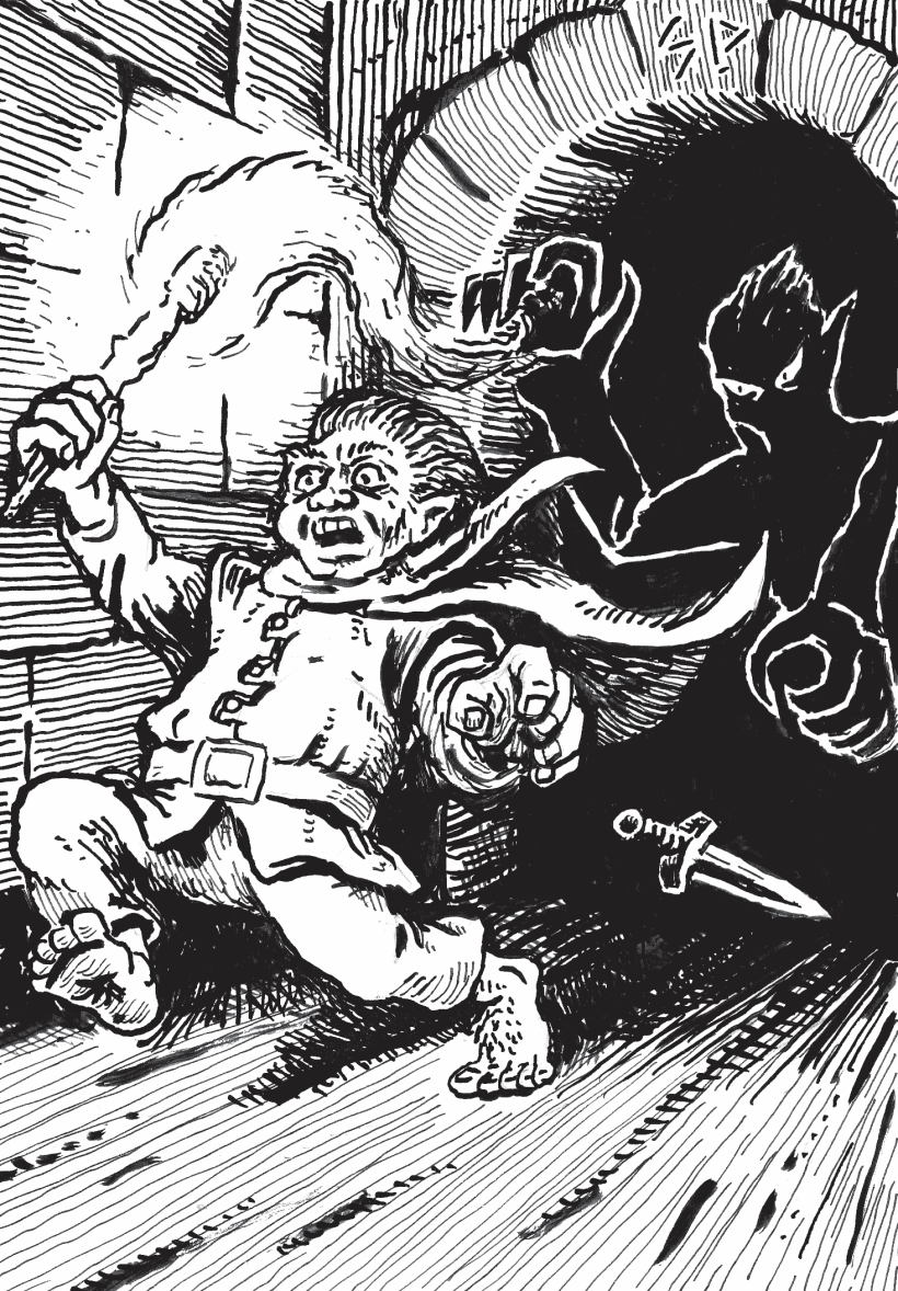 Za pomoci jeptiščiných modliteb, Solisova požehnání, které stále ještě ulpívalo na některých zbraních, a kouzelníkova amuletu, který mu darovala Ropuší bába, se jim povedlo vykřesat dostatek světla aspoň k tomu, aby se mohli dostat pryč z místnosti – prokletá temnota je však následovala. Rozběhli se směrem na sever, doufajíce, že se dostanou ke schodišti do mohyly, ve které ležel zlatý meč Brnimar, cestu jim ale zastoupilo několik kostlivců, postupujících v hávu tmy. Povedlo se jim ale skrz ně – byť bylo citelné, že jim jakási nesvatá síla propůjčuje nebývalou sílu – probojovat i se zesláblým trpaslíkem dřív, než je z druhé strany dostihlo několik rychle se pohybujících a hladových mrtvol, a dokázali jim na poslední chvíli zabouchnout dveře a dostat se zpět na denní světlo.
